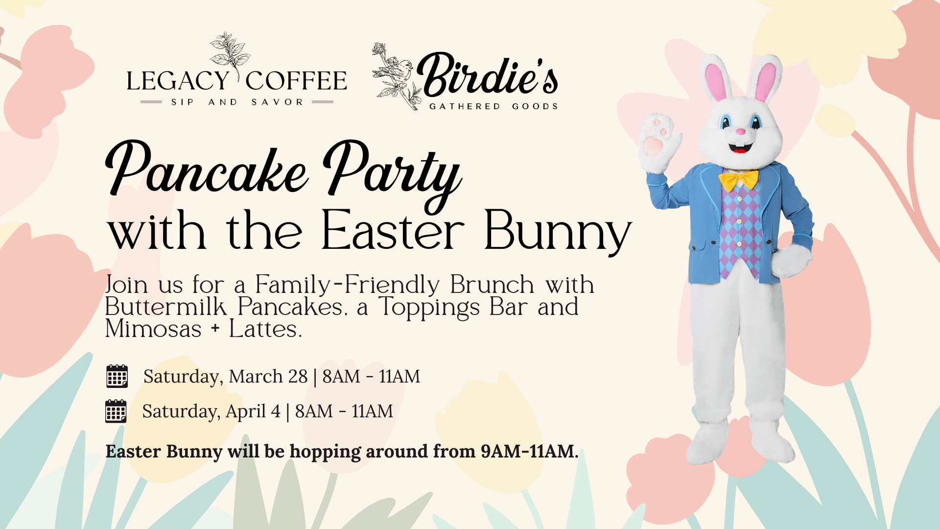 Join us for our Pancake Party with the Easter Bunny on March 28 and April 4 from 8AM–11AM, a family friendly Easter celebration at Legacy Coffee & Birdie’s Gathered Goods.
