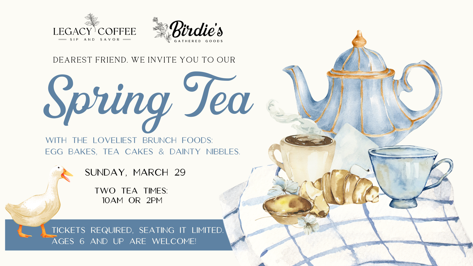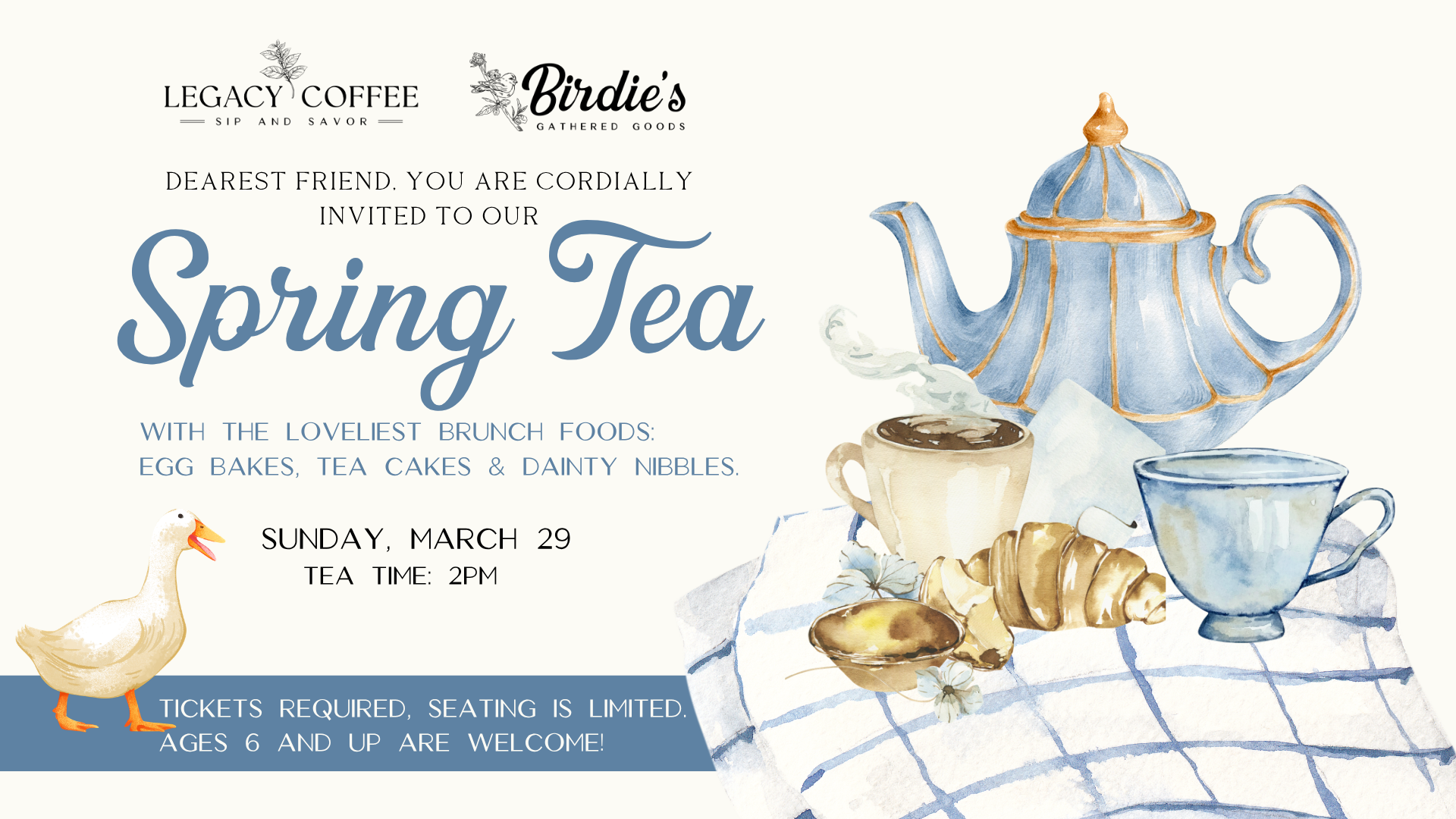 It would give us the greatest pleasure if you would join us on the 29th of March for a most delightful Spring Tea Party Brunch. The table shall be laid most handsomely, the teapots warm and waiting, and the tiers quite obligingly stacked with the loveliest little sandwiches, sweet cakes, and dainty nibbles one could hope for.